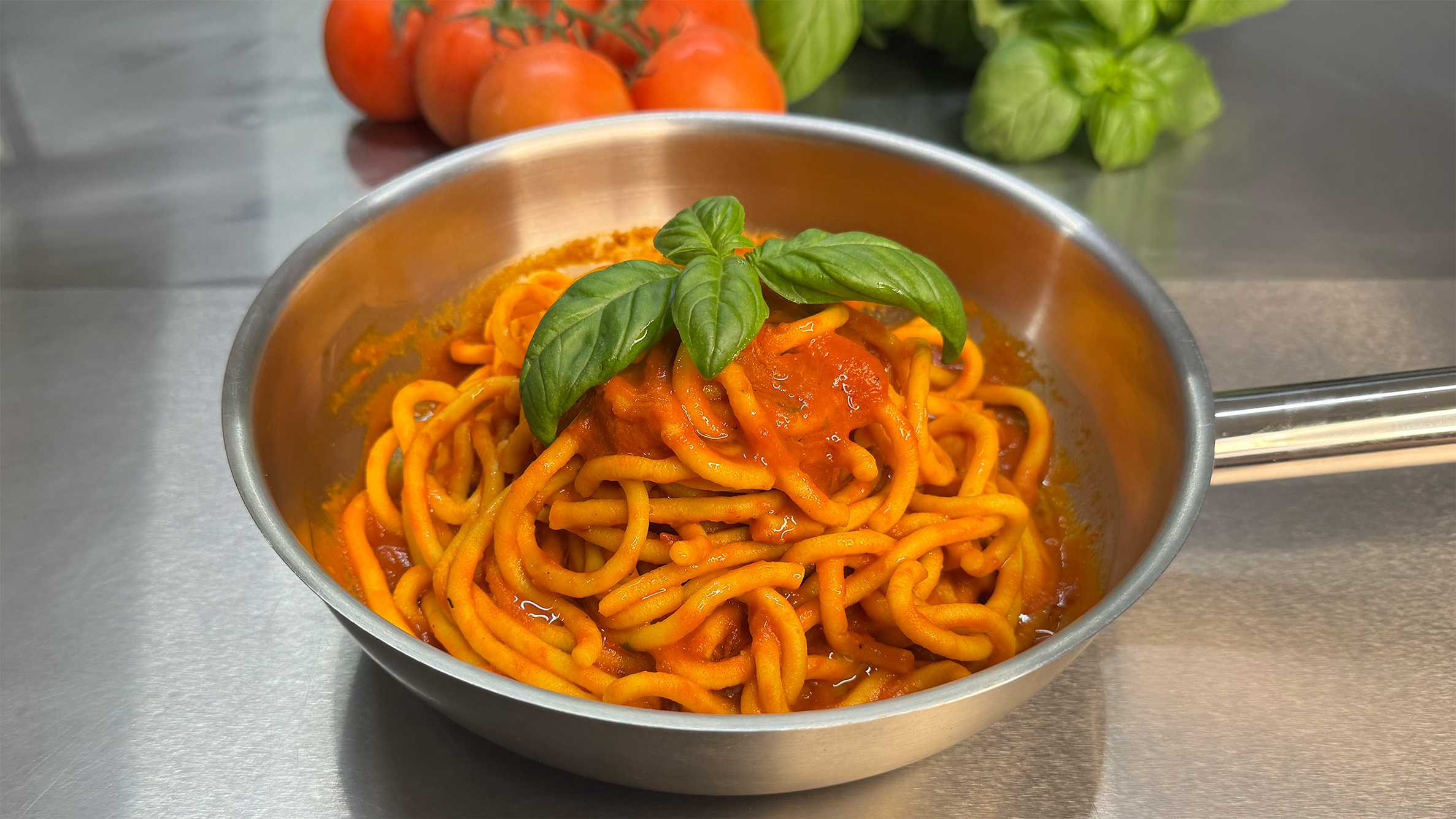 Sugo artigianale, realizzato con 3 tipologie di pomodori differenti per dare un gusto unico. 100% fatto in casa. Chiedi al nostro personale i formati di pasta disponibili.