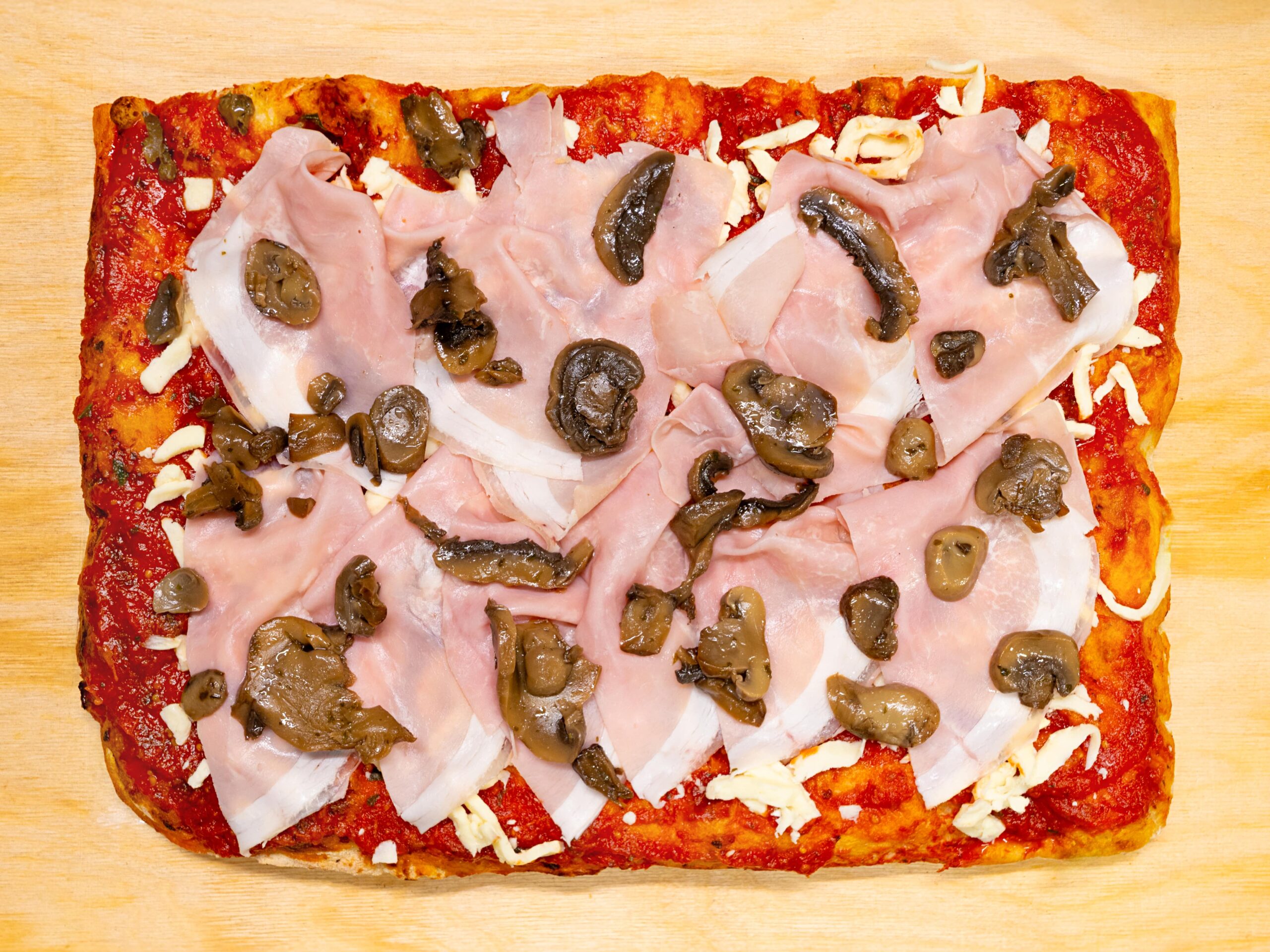 Salsa di Pomodoro, Mozzarella Fior di Latte, Prosciutto Cotto, Funghi Champignon Trifolati, Olio EVO