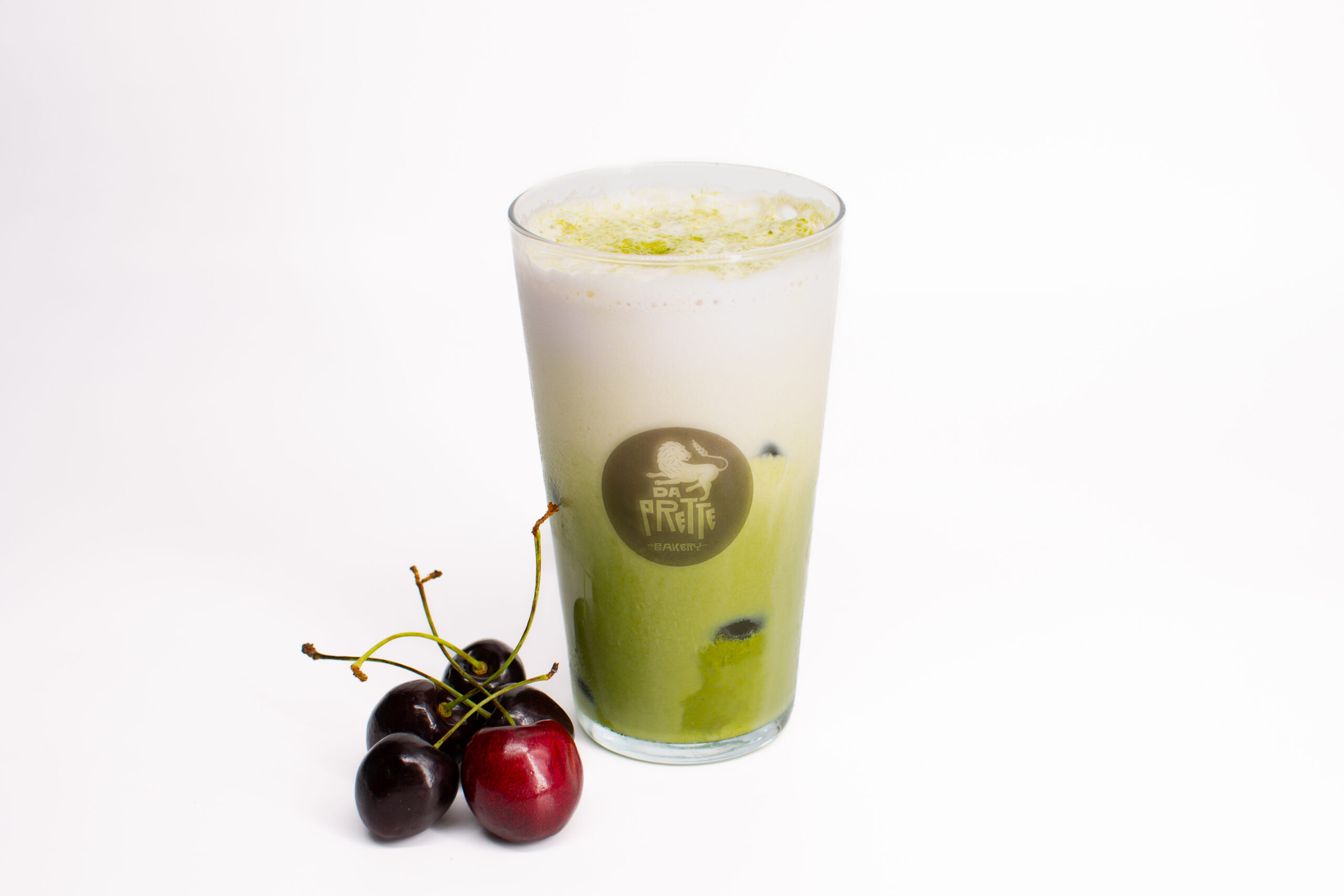 Latte montato con sciroppo di ciliegia, sormontato da un delicato strato di matcha. Un contrasto sorprendente tra dolcezza fruttata e freschezza vegetale, per un drink artigianale unico e scenografico.