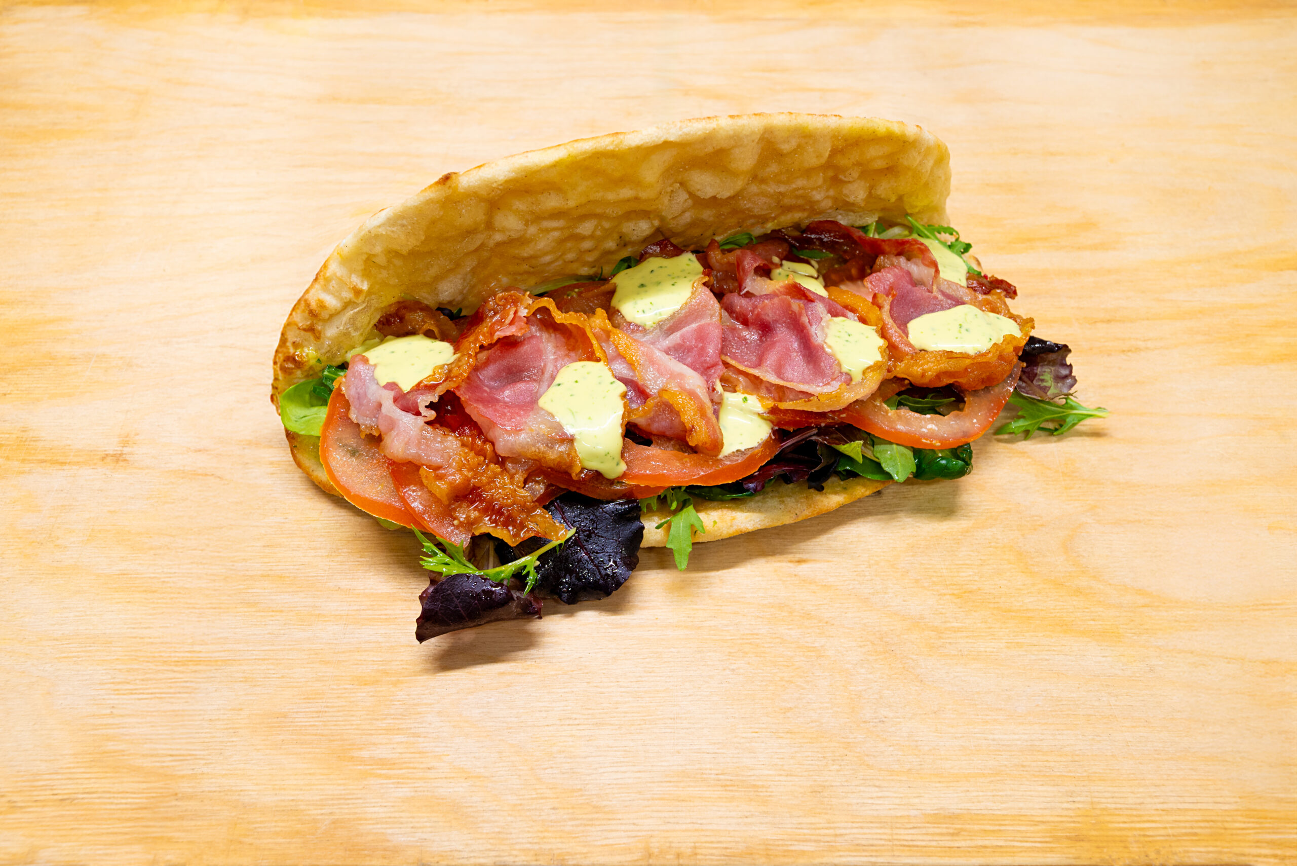 Pancetta Croccante, Pomodoro, Maionese al Coriandolo, Insalata