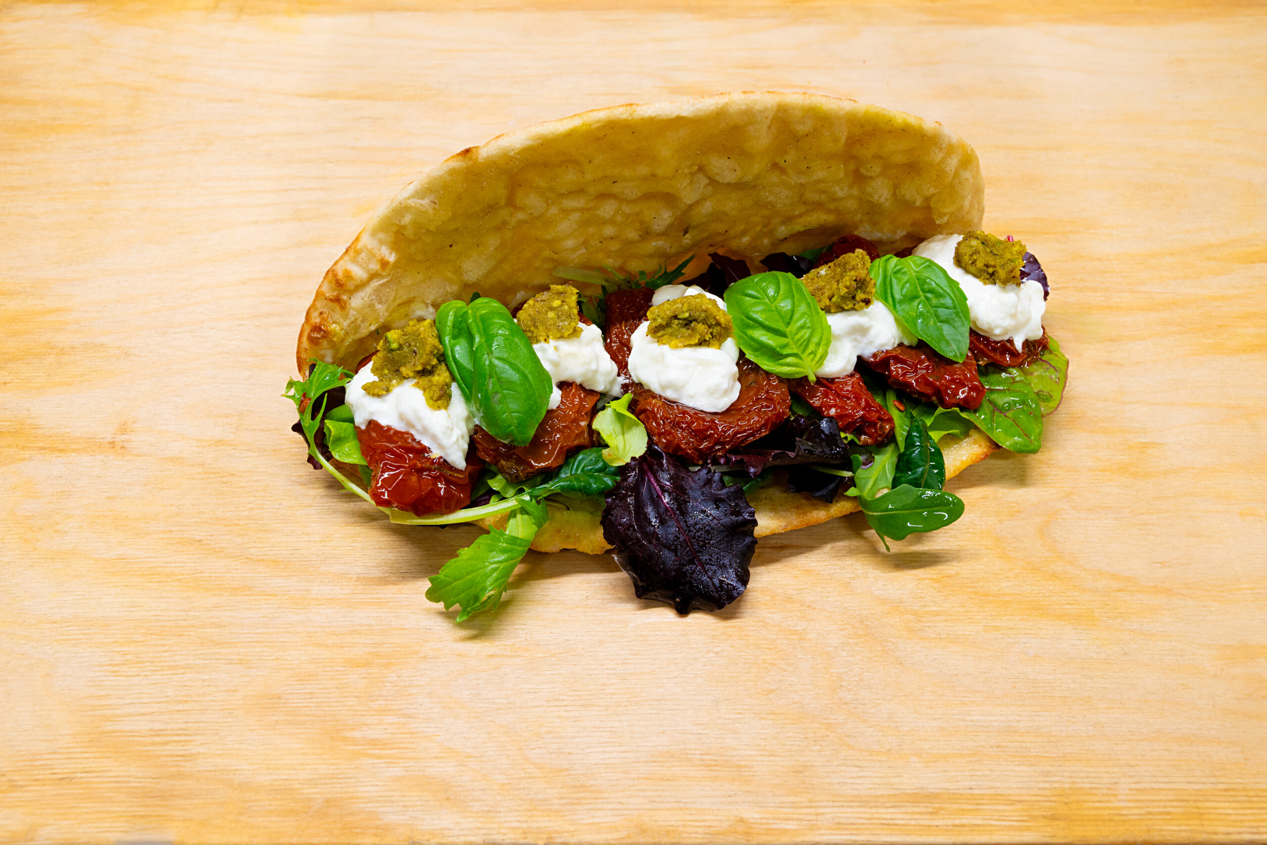 Stracciatella, Pesto di Pistacchio, Pomodori Secchi, Basilico, Insalata