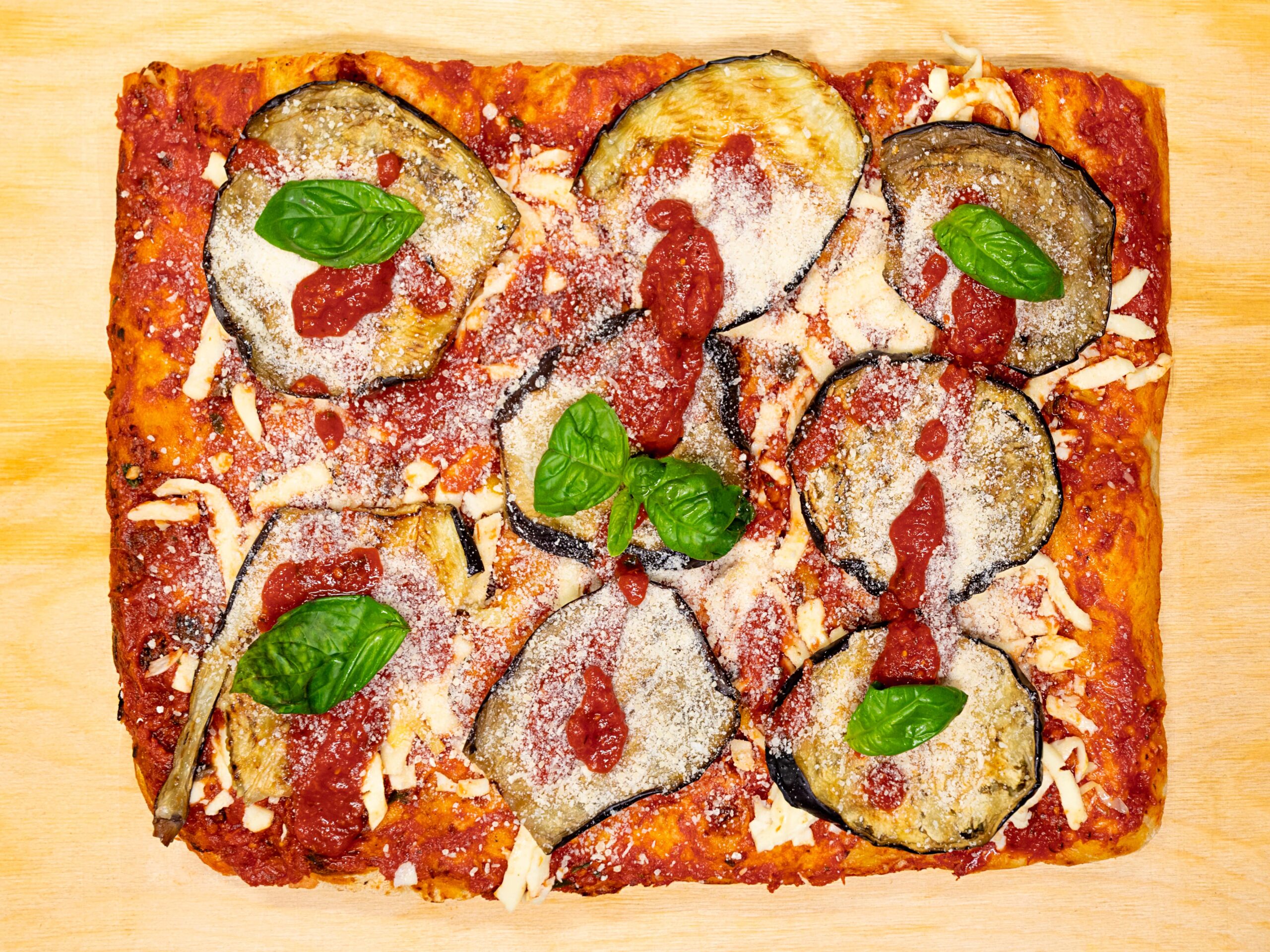 Salsa di Pomodoro, Mozzarella Fior di Latte, Melanzane Grigliate, Formaggio grattuggiato.