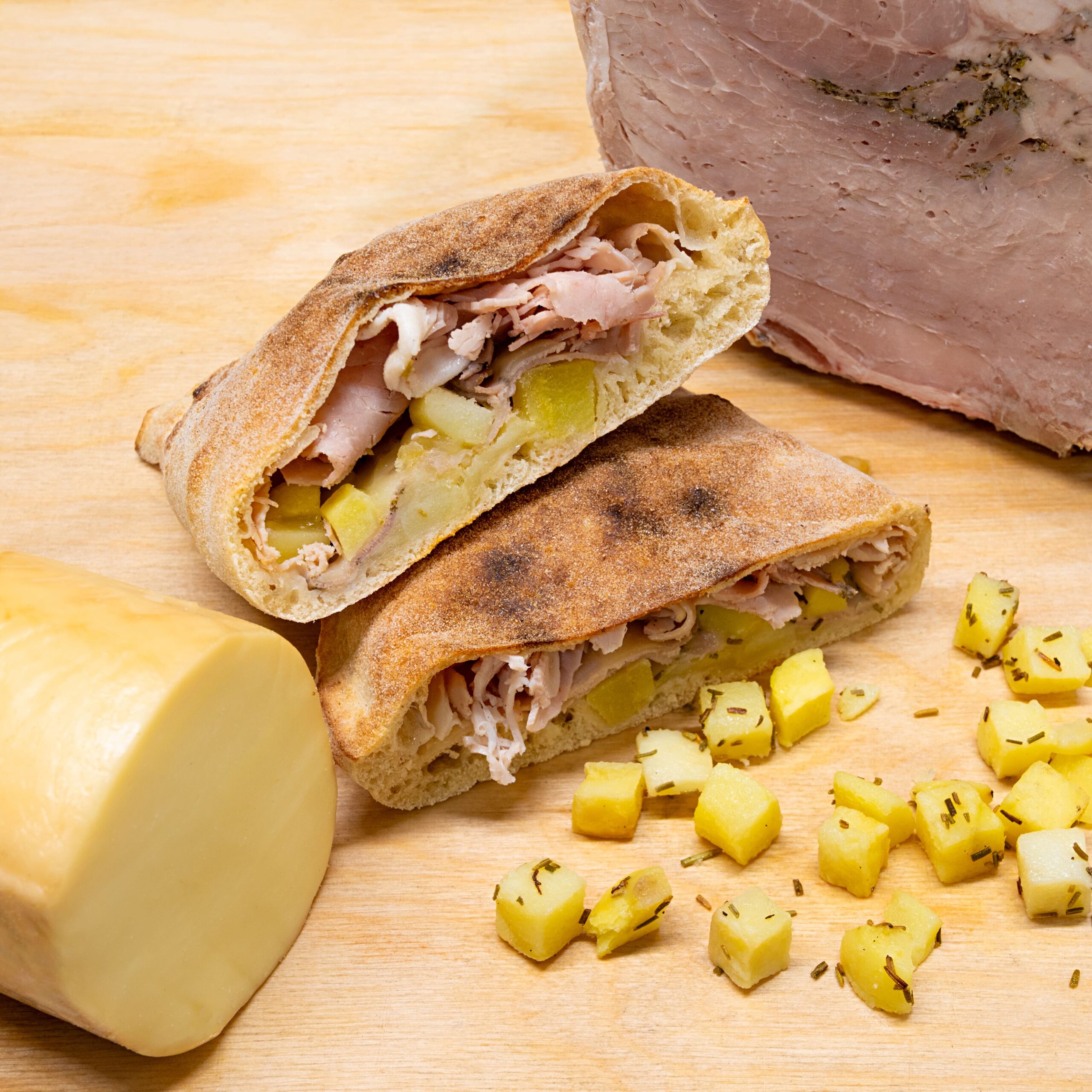 +1,00€ SERVIZIO AL TAVOLO – Mozzarella, porchetta trevigiana, scamorza affumicata, patate al forno, rosmarino.
