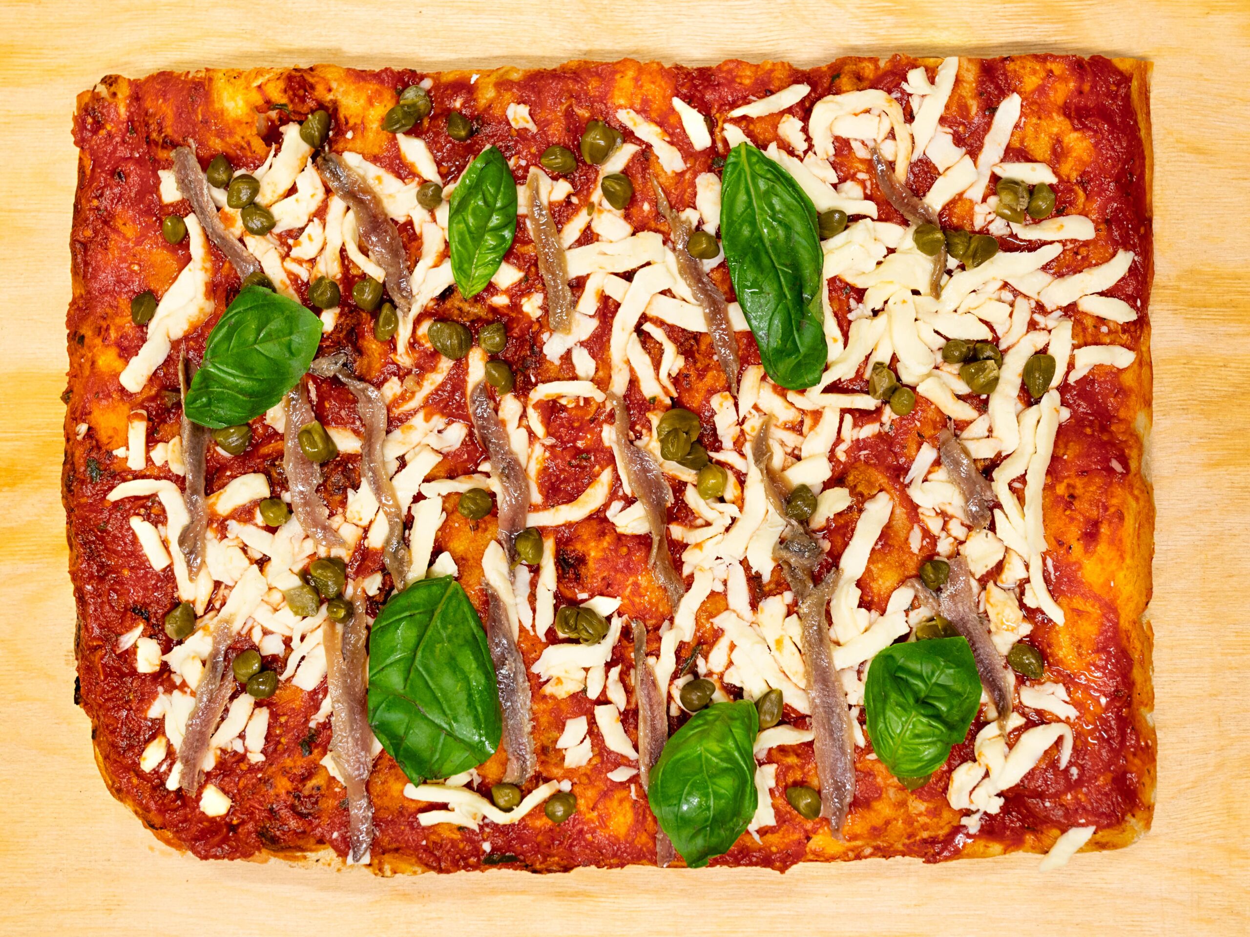 Salsa di Pomodoro, Mozzarella Fior di Latte, Acciughe, Capperi, Olive, Origano, Basilico, Olio EVO
