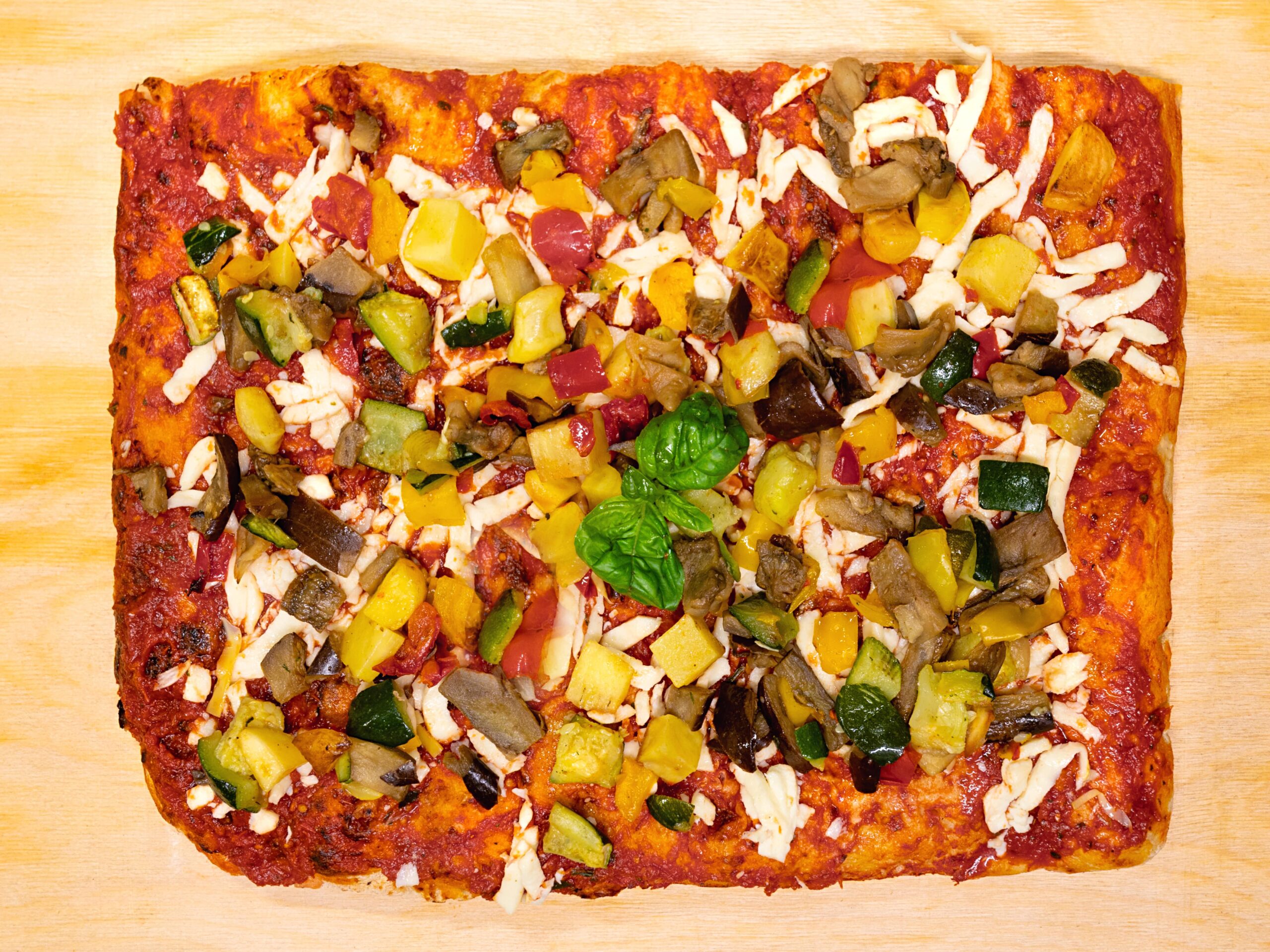 Salsa di Pomodoro, Mozzarella Fior di Latte, Verdure Grigliate (zucchine, melanzane, patate, peperoni), Origano, Basilico, Olio EVO
